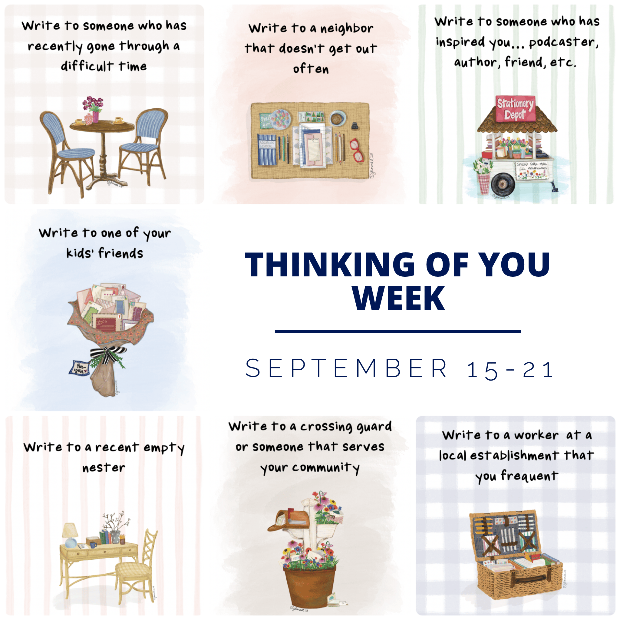 Thinking of You Week starts Sunday. Maybe you could carve out some time and pen some kind thoughts to a few people in your circle or community? You could send a note to someone you know, someone you are only acquainted with, or a total stranger. The point is to actually let them know they’ve been on your mind. I’ve included some ideas below to help you brainstorm… who have you noticed around you that might perk up by receiving your encouraging words?